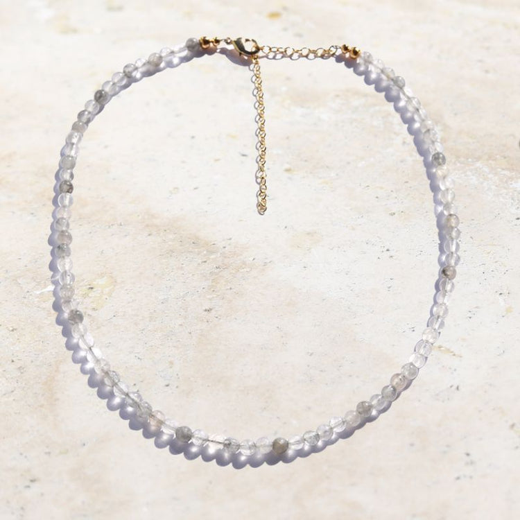 Casual and delicate beaded gemstone necklace made with smooth cloudy quartz beads.