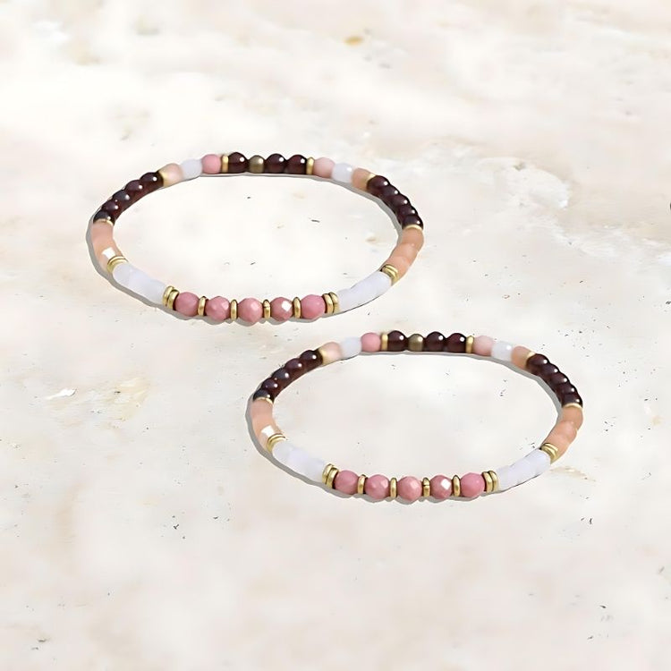 - Dainty gemstone bracelet made with garnet, sunstone, and rose quartz.
