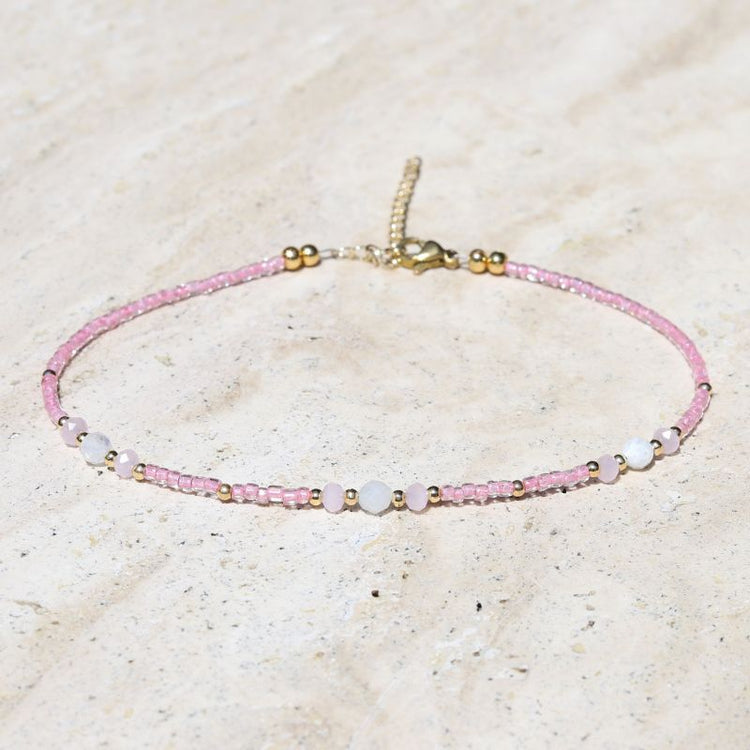 - Delicate gemstone anklet made with genuine pink moosntone.