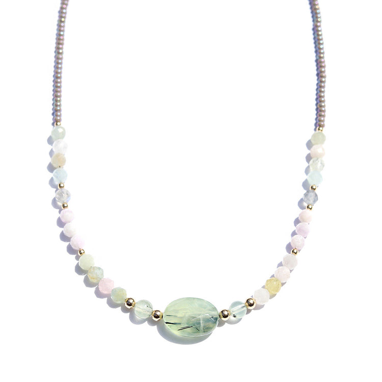 This Prehnite and Morganite beaded necklace is a stunning piece that combines the gentle, pink hues of Morganite with the intriguing, green tones of Prehnite.