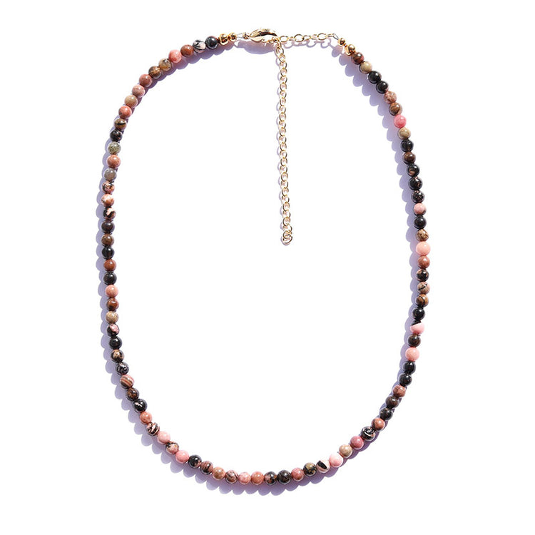 Casual and delicate beaded gemstone necklace made with smooth rhodonite beads.
